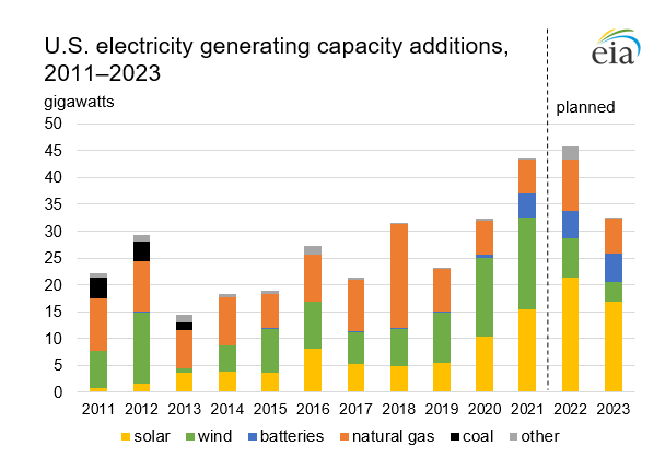 美國能源信息署(EIA)預(yù)計,美國未來兩年所有能源的裝機容量將增加78GW。其中大部分將是大型太陽能發(fā)電設(shè)施和儲能項目,預(yù)計將增長62%,總裝機容量為49GW。這個數(shù)字并不包括小型分布式住宅太陽能發(fā)電項目增加的裝機容量。
