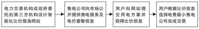 售電公司必須通過電力交易機構平臺向市場公開提供自己的產品(服務)及電價套餐,并明確信息有效期限。用戶在電力交易機構平臺上提出比價服務委托要求,提供自己的年度用電方案,可提出擬比較的售電公司;電力交易機構或受委托的第三方機構通過比價網(wǎng)為用戶提供相應用電方案下不同售電公司的年電費結果等比價信息,供用戶選擇售電公司時決策參考。