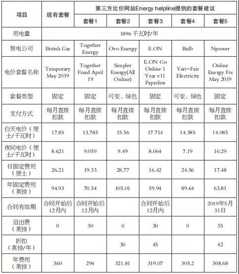 目前國外成熟電力零售市場幾乎都按這種交易機制組織,售電公司提供幾百種售電產品(服務)及電價套餐供用戶選擇,不僅公開透明,而且交易效率高,既體現(xiàn)現(xiàn)代經(jīng)濟思想,也符合傳統(tǒng)市場精神。例如,英國用戶可以在售電公司網(wǎng)站獲取相關的電費套餐信息,而且售電公司網(wǎng)站免費提供與其他售電公司的電價比較業(yè)務。為防止售電公司網(wǎng)站提供的比價信息不客觀,在政府監(jiān)管機構的干預下,產生了第三方比價網(wǎng)站,如The Energy Shop,Runpath,Energy Helpline,uSwitch等,提供的服務包括每種價格套餐的詳細信息和用戶最適合的電價套餐建議。如,用戶在英國第三方比價網(wǎng)站Energy helpline進行電價套餐比選,首先輸入用戶郵編,接著輸入用戶用電信息,假設用戶目前使用的是British Gas公司的Temporary May 2019套餐,且采用Economy 7計量方式,電費支付方式為每月直接扣款,每月電費為30英鎊。用戶信息輸入完畢后,Energy helpline會給出幾十種電價套餐建議,并選取其中5種電價套餐與用戶目前使用套餐進行比較。表1可以清楚地說明英國電力零售市場用戶比價選擇的過程。