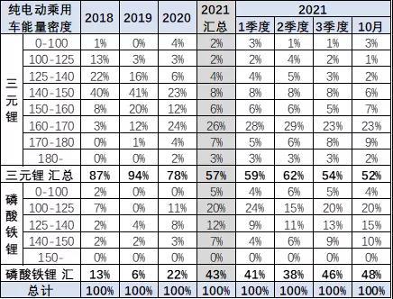 從分類數(shù)據(jù)來看,乘用車的三元鋰電的需求暫時回落,2021年4季度的10月達到整體汽車電池需求的61%。3季度的磷酸鐵鋰需求明顯回升,達到38%。