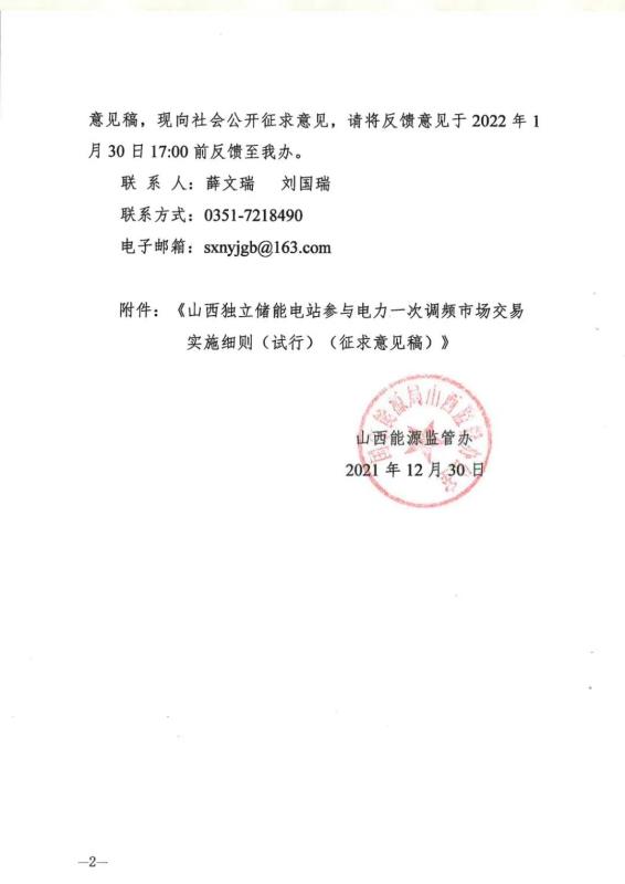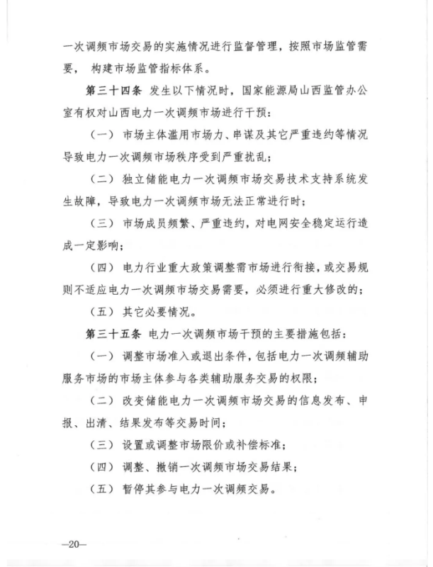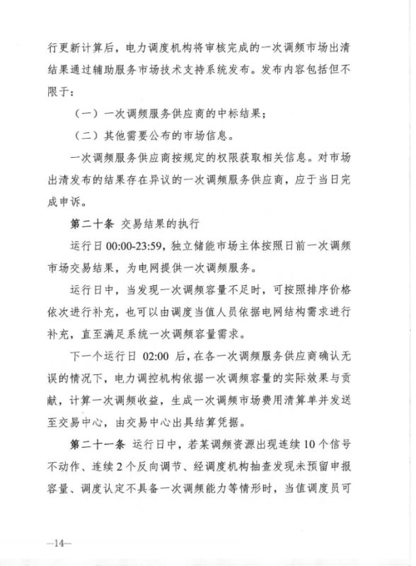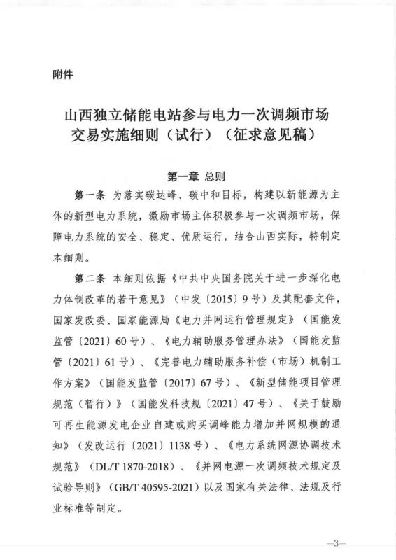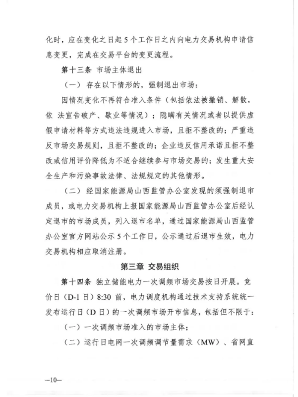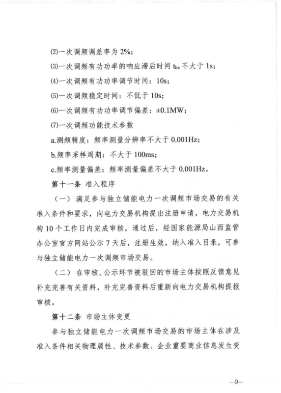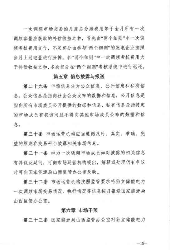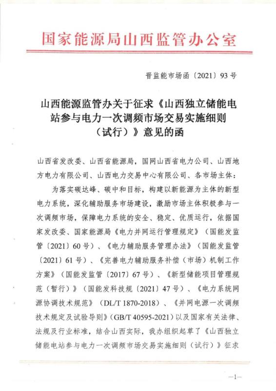 中國(guó)儲(chǔ)能網(wǎng)訊:12月30日,山西能源監(jiān)管辦發(fā)布關(guān)于征求《山西獨(dú)立儲(chǔ)能電站參與電力一次調(diào)頻市場(chǎng)交易實(shí)施細(xì)則(試行) 》意見的函,其中關(guān)于交易組織章節(jié)規(guī)定,獨(dú)立儲(chǔ)能電力一次調(diào)頻市場(chǎng)交易按日開展。競(jìng)價(jià)日(D-1 日) 8: 30 前,電力調(diào)度機(jī)構(gòu)通過(guò)技術(shù)支持系統(tǒng)統(tǒng)一 發(fā)布運(yùn)行日(D 日) 的一次調(diào)頻市場(chǎng)開市信息。