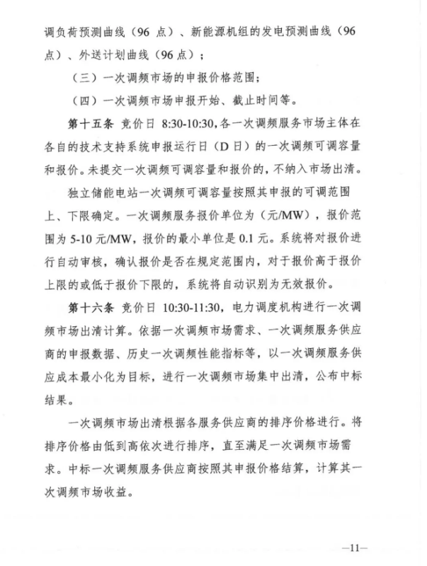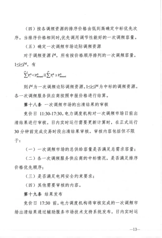 競(jìng)價(jià)日 10: 30-11:30,電力調(diào)度機(jī)構(gòu)進(jìn)行一次調(diào)頻市場(chǎng)出清計(jì)算。依據(jù)一次調(diào)頻市場(chǎng)需求、一次調(diào)頻服務(wù)供應(yīng)商的申報(bào)數(shù)據(jù)、歷史一次調(diào)頻性能指標(biāo)等,以一次調(diào)頻服務(wù)供應(yīng)成本最小化為目標(biāo),進(jìn)行一次調(diào)頻市場(chǎng)集中出清,公布中標(biāo)結(jié)果。