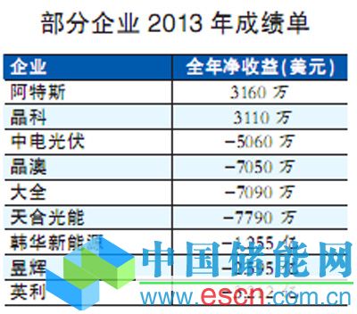 中國儲(chǔ)能網(wǎng)訊:4月中旬,光伏幾大上市企業(yè)相繼交出2013年全年業(yè)績“成績單”,從各企業(yè)發(fā)布的2013全年財(cái)報(bào)來看,光伏行業(yè)一改近幾年的“俱損”狀態(tài),在實(shí)施各自戰(zhàn)略后,今年的“成績單”出現(xiàn)明顯分化。其中,阿特斯、晶科兩家企業(yè)雙雙扭虧為盈,全年收益均在3000萬美元以上,其余各家光伏企業(yè)尚未擺脫虧損困局。