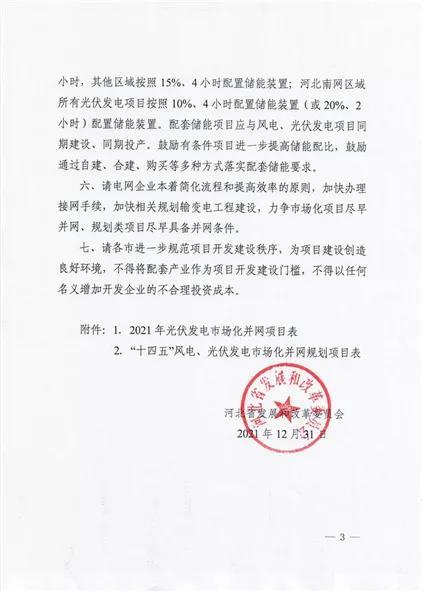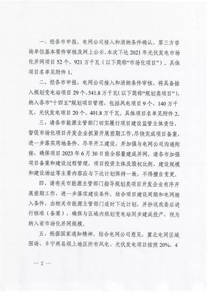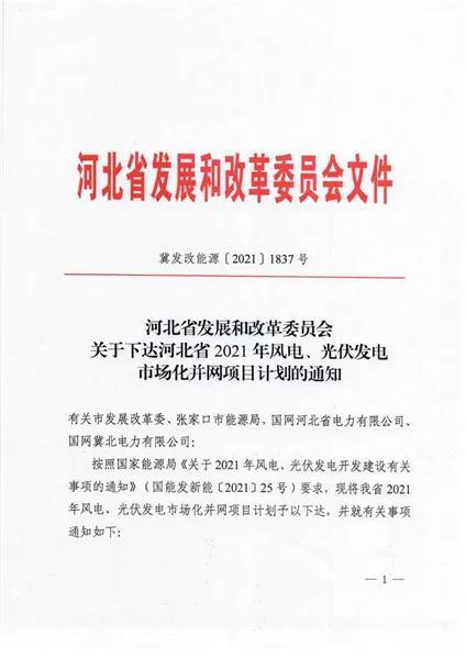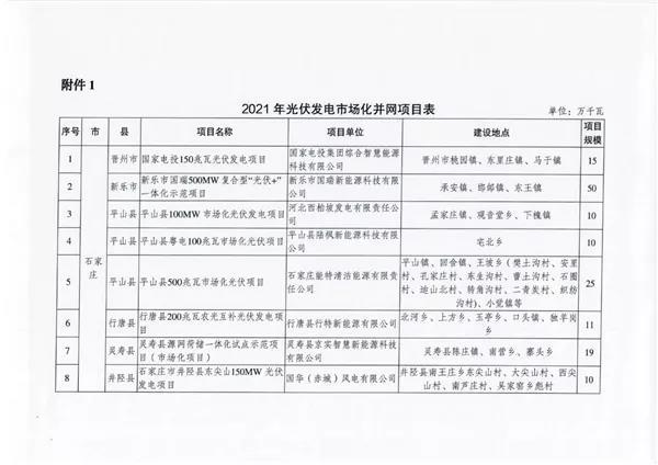 中國儲能網(wǎng)訊:2021年12月31日,河北省發(fā)改委下發(fā)《關(guān)于下達(dá)河北省2021年風(fēng)電、光伏發(fā)電市場化并網(wǎng)項目計劃的通知》,下達(dá)了2021年光伏發(fā)電市場化并網(wǎng)項目52個,921萬千瓦,以及29個共計541.8萬千瓦"十四五”風(fēng)電、光伏發(fā)電市場化并網(wǎng)規(guī)劃項目(2024~2025年落地)。