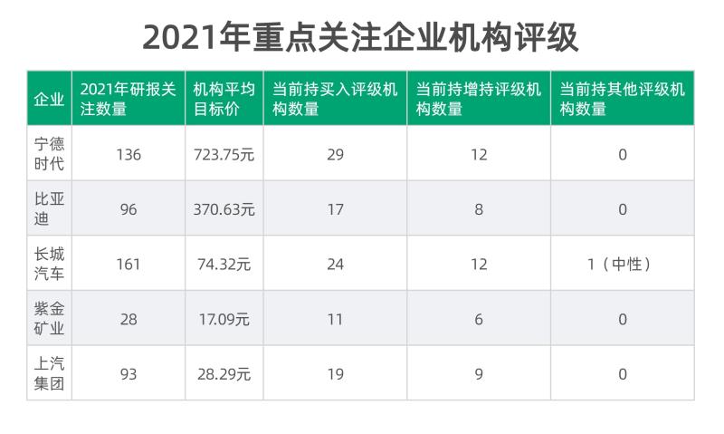 在2021年重點關注的A股新能源汽車產(chǎn)業(yè)鏈上市公司中,5家市值排名靠前的企業(yè)分別為寧德時代、比亞迪、長城汽車、紫金礦業(yè)和上汽集團。其中,寧德時代在2021年獲得136份券商研報關注,平均目標價為723.75元/股;長城汽車則獲得最多的161份券商研報關注,目標價平均為74.32元/股。