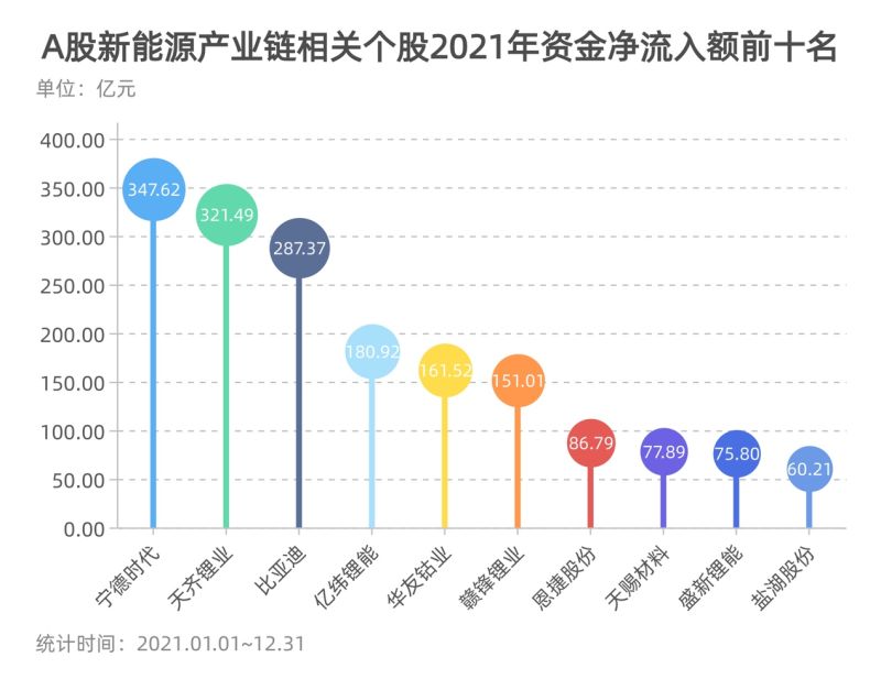 此外,天齊鋰業(yè)(002466.SZ)、比亞迪(002594.SZ)、億緯鋰能(300014.SZ)、華友鈷業(yè)(603799.SH)、贛鋒鋰業(yè)(002460.SZ)在2021年也獲得青睞,該年度內(nèi)的凈主動買入額均超100億元。