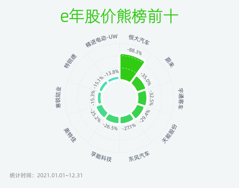 跌幅榜方面,恒大汽車(0708.HK)成為2021年“負班長”,股價年跌幅為88.3%。在2021年,恒大汽車股價經(jīng)歷了大起大落。2021年4月,恒大汽車股價整體呈上漲趨勢,4月市值環(huán)比增加204.15億元至4886.95億元,反超比亞迪(002594.SZ)登頂中國車企市值榜。