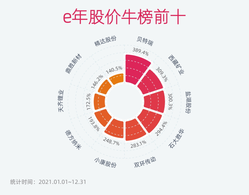 回顧2021年新能源汽車產(chǎn)業(yè)鏈表現(xiàn),股價漲幅居前的多為動力電池及鋰礦相關概念股,占據(jù)了前十榜單的七席。其中,位居榜首的是貝特瑞(835185.BJ),主要布局電池負材料,股價年漲幅約為389.4%。