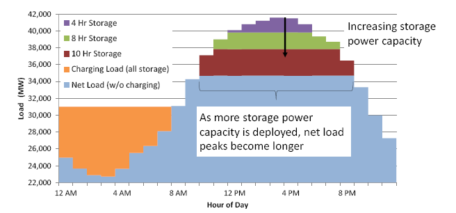 一個關(guān)鍵因素是儲能部署本身的影響;儲能系統(tǒng)在本質(zhì)上是為了減少峰值電力需求,并產(chǎn)生更長的凈負載峰值。圖4提供了一個示例,顯示了佛羅里達州使用的示例,按持續(xù)時間來順序添加部署儲能系統(tǒng)將如何滿足時間更長的峰值期間。