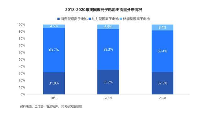 按應(yīng)用領(lǐng)域不同,鋰離子電池主要分為消費(fèi)型、動(dòng)力型和儲(chǔ)能型三大類。其中,動(dòng)力型鋰離子電池占主導(dǎo)地位,儲(chǔ)能型鋰離子電池增速較快。具體來看,根據(jù)賽迪智庫數(shù)據(jù),2020年,主要應(yīng)用于新能源汽車、電動(dòng)自行車、電動(dòng)工具三大市場的動(dòng)力型鋰離子電池出貨量達(dá)94.1GWh,占鋰離子電池總出貨量的59.4%;廣泛應(yīng)用于儲(chǔ)能電站、5G 基站等領(lǐng)域的儲(chǔ)能型鋰離子電池出貨量為13.4GWh,同比增長55.8%。