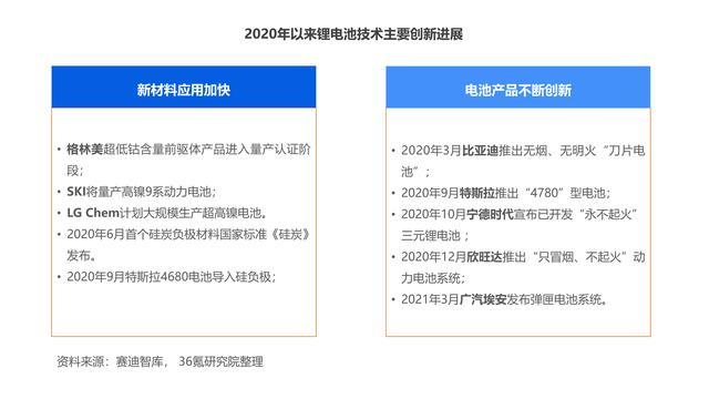 一方面,為提升鋰離子電池能量密度,同時(shí)達(dá)到控制生產(chǎn)成本目的,國內(nèi)外知名企業(yè)開始加速低鈷乃至無鈷正極材料、硅基負(fù)極材料等新材料在鋰離子電池生產(chǎn)研制過程中的應(yīng)用。另一方面,2020年以來,隨著寧德時(shí)代、比亞迪、LG化學(xué)等產(chǎn)業(yè)龍頭企業(yè)持續(xù)推進(jìn)技術(shù)研發(fā)與創(chuàng)新,高鎳低鈷電池、硅負(fù)極材料電池、“永不起火”[1]電池、固態(tài)電池等創(chuàng)新產(chǎn)品得到快速發(fā)展。