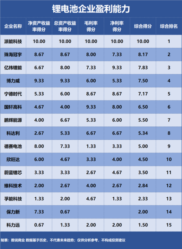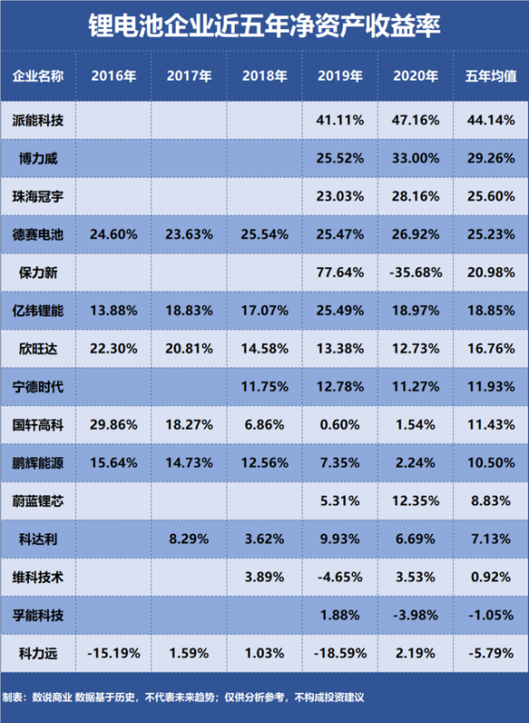 從近五年凈資產(chǎn)收益率來(lái)看,派能科技、博力威、珠海冠宇、德賽電池、保力新等5家企業(yè)超過(guò)20%,其中派能科技平均凈資產(chǎn)收益率達(dá)到44.14%。