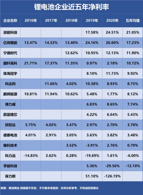 從近五年凈利率來(lái)看,派能科技、億緯鋰能、寧德時(shí)代、國(guó)軒高科等4家企業(yè)超過(guò)10%,其中億緯鋰能平均凈利率達(dá)到17.23%。