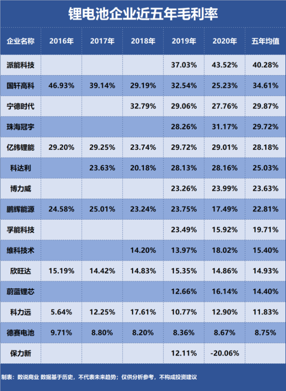 從近五年毛利率來(lái)看,派能科技、國(guó)軒高科、寧德時(shí)代、珠海冠宇、億緯鋰能、科達(dá)利等6家企業(yè)超過(guò)25%,其中國(guó)軒高科平均毛利率達(dá)到34.61%。