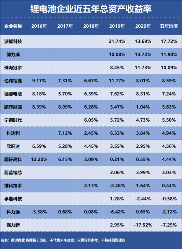 從近五年總資產(chǎn)收益率來(lái)看,派能科技、博力威、珠海冠宇等3家企業(yè)超過(guò)10%,其中博力威平均總資產(chǎn)收益率達(dá)到11.90%。