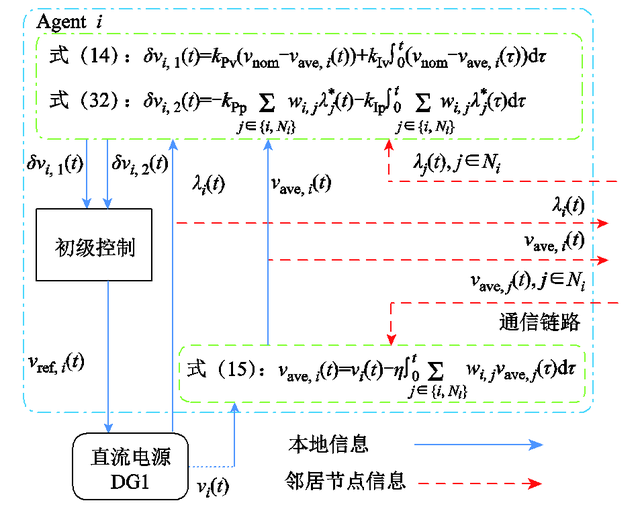 針對(duì)直流微電網(wǎng)經(jīng)濟(jì)調(diào)度問題,近年來提出了一些分布式經(jīng)濟(jì)調(diào)度策略。有學(xué)者基于有限步一致性算法設(shè)計(jì)了交直流混合微電網(wǎng)分布式經(jīng)濟(jì)調(diào)度策略。然而,該控制策略沒有考慮交直流混合微電網(wǎng)的電壓、頻率二次調(diào)節(jié)。有學(xué)者提出一種直流微電網(wǎng)分布式分層控制策略:在其三次控制層,通過分布式一致算法調(diào)整下垂控制的虛擬阻抗以實(shí)現(xiàn)經(jīng)濟(jì)調(diào)度;在二次控制層,通過分布式一致算法生成下垂控制的電壓補(bǔ)償量以實(shí)現(xiàn)電壓恢復(fù)。然而,三次優(yōu)化調(diào)度層的時(shí)間尺度大于二次電壓恢復(fù)控制層,無法在同一小時(shí)間尺度下對(duì)微電網(wǎng)進(jìn)行控制與優(yōu)化,從而無法進(jìn)一步提高直流電網(wǎng)運(yùn)行效率。此外,虛擬阻抗的大范圍實(shí)時(shí)調(diào)整給系統(tǒng)的電壓穩(wěn)定控制帶來挑戰(zhàn)。