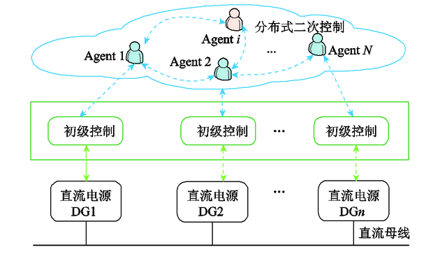 直流微電網(wǎng)分布式分層控制結(jié)構(gòu)如圖1所示,分層控制結(jié)構(gòu)通常包括初級(jí)控制、二次控制和三次控制(圖中未畫出),并且從下層到上層時(shí)間尺度依次增加。初級(jí)控制通常采用下垂控制策略,并通過控制各電源的輸出電壓和電流,實(shí)現(xiàn)負(fù)荷在各電源間的初級(jí)分配。二次控制通常負(fù)責(zé)微電網(wǎng)系統(tǒng)級(jí)的穩(wěn)定控制,如通過集中式或分布式的方式實(shí)現(xiàn)微電網(wǎng)母線電壓的恢復(fù)控制。三次控制通常負(fù)責(zé)管理微電網(wǎng)的優(yōu)化運(yùn)行,如經(jīng)濟(jì)調(diào)度。
