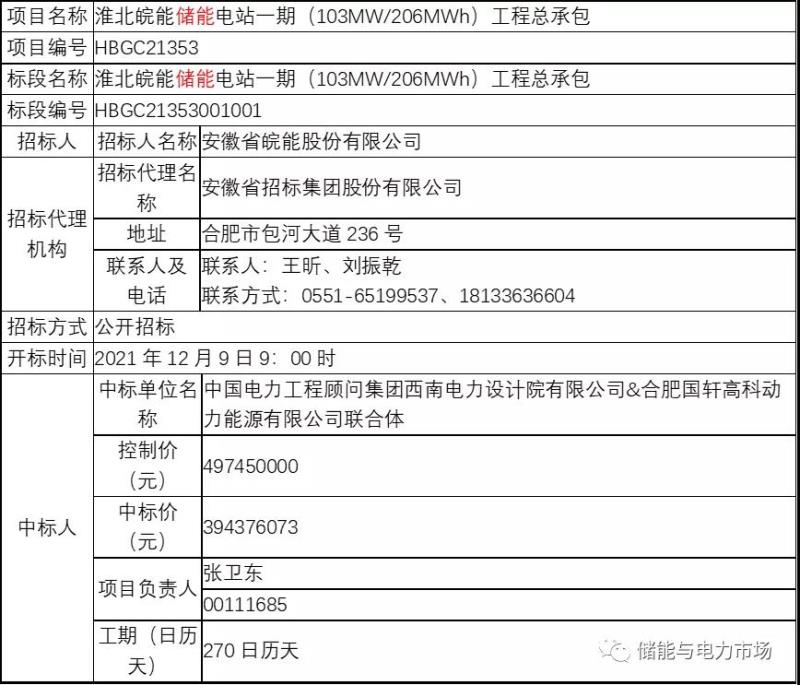 淮北皖能儲能電站一期(103MW/206MWh)工程總承包中標結(jié)果公示