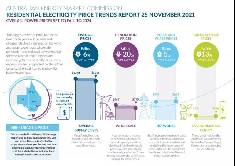 中國儲(chǔ)能網(wǎng)訊:澳大利亞能源市場委員會(huì)(AEMC)預(yù)計(jì),到2024年,家庭用戶用電費(fèi)用將較2021年下降約6%。其中,批發(fā)價(jià)格受可再生能源發(fā)電規(guī)模擴(kuò)大、儲(chǔ)能快速發(fā)展等因素影響,將下降約20%;與環(huán)境計(jì)劃相關(guān)的價(jià)格減少約13%;輸配電價(jià)是唯一上漲的部分,預(yù)計(jì)小幅上漲5%左右。