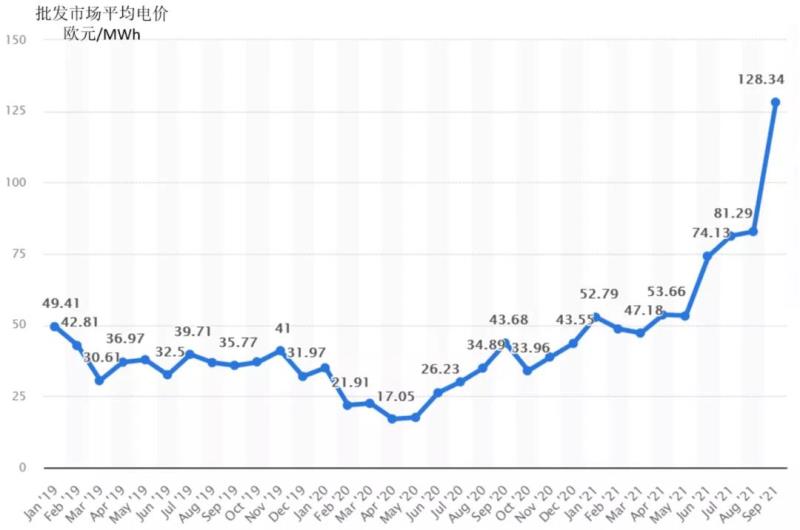 二是電價隨成本迅速攀升。2021年年初以來,德國的電力批發(fā)價格上漲了60%以上,2021年7月和8月份電價不斷飆升至歷史新高,9月中旬歐洲能源交易所的德國電價首次達到了100歐元/兆瓦時。