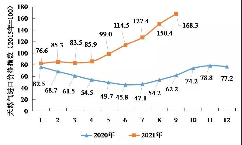 一是傳統(tǒng)能源價格突破歷史紀錄。整個歐洲方面,被視為歐洲天然氣價格風向標的荷蘭天然氣期貨價格TTF于2021年10月5日突破了每千立方米1200美元,創(chuàng)下歷史新高。根據(jù)德國聯(lián)邦統(tǒng)計局的數(shù)據(jù),2021年,德國天然氣進口價格整體呈上漲趨勢,2020至2021年9月,德國天然氣進口價格指數(shù)(該指數(shù)以2015年價格為100)持續(xù)快速上升。2021年9月份天然氣進口價格比去年同期上漲171%。