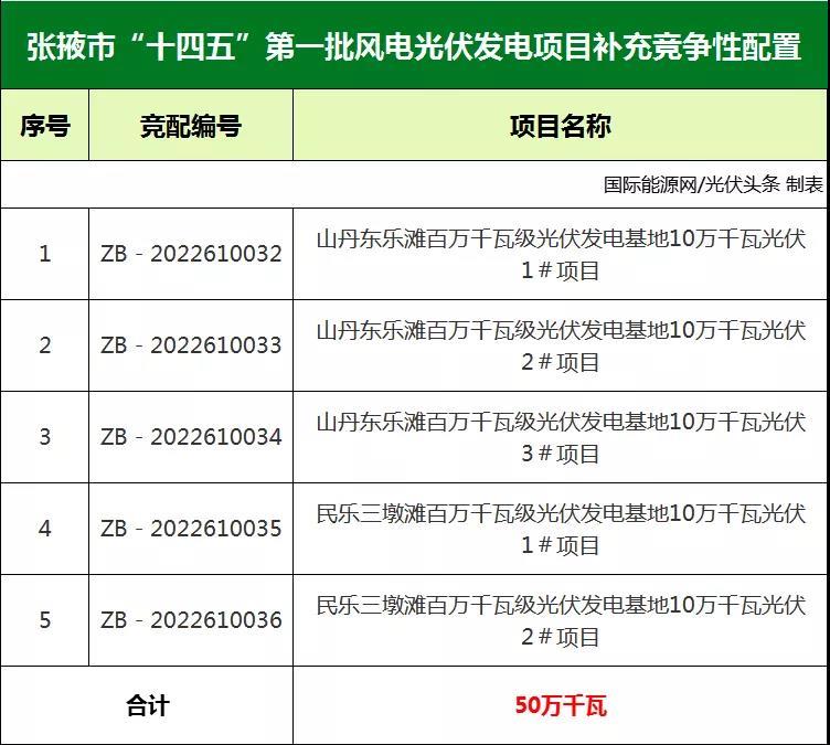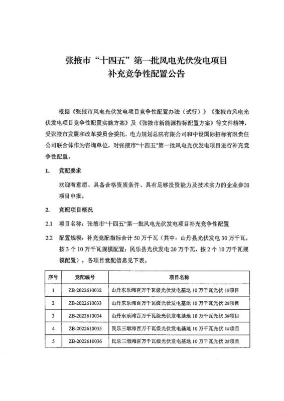 中國(guó)儲(chǔ)能網(wǎng)訊:1月10日,甘肅省張掖市人民政府發(fā)布張掖市“十四五”第一批風(fēng)電光伏發(fā)電項(xiàng)目補(bǔ)充競(jìng)爭(zhēng)性配置公告。根據(jù)公告,配置規(guī)模為:補(bǔ)充競(jìng)配指標(biāo)合計(jì)50萬(wàn)千瓦(其中:山丹縣光伏發(fā)電30萬(wàn)千瓦,按3個(gè)10萬(wàn)千瓦規(guī)模配置;民樂縣光伏發(fā)電20萬(wàn)千瓦,按2個(gè)10萬(wàn)千瓦規(guī)模配置),各項(xiàng)目競(jìng)配信息見下表。