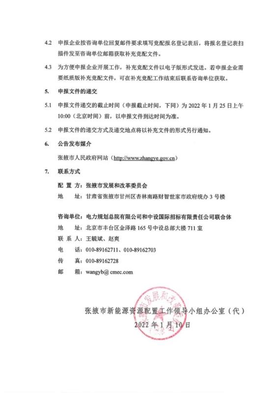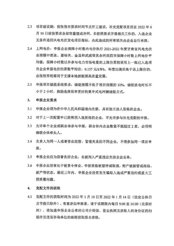 根據(jù)公告,項(xiàng)目建設(shè)期為按張掖市要求時(shí)間節(jié)點(diǎn)開工建設(shè),補(bǔ)充競(jìng)配項(xiàng)目應(yīng)在2022年6月30日前按要求全部容量建成并網(wǎng),未按照要求開展相關(guān)工作的,入選企業(yè)無(wú)條件退回風(fēng)電光伏發(fā)電項(xiàng)目指標(biāo),由此造成的所有損失由企業(yè)自行承擔(dān)。