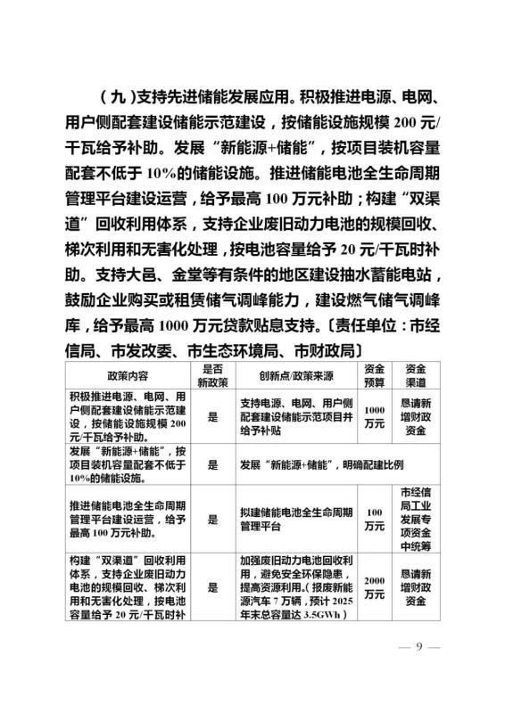 中國(guó)儲(chǔ)能網(wǎng)訊:1月6日,成都市經(jīng)濟(jì)和信息化局發(fā)布關(guān)于公開(kāi)征求《成都市能源結(jié)構(gòu)調(diào)整十條政策措施》意見(jiàn)建議的通知。建議指出支持先進(jìn)儲(chǔ)能發(fā)展應(yīng)用。積極推進(jìn)電源、電網(wǎng)、用戶側(cè)配套建設(shè)儲(chǔ)能示范建設(shè),按儲(chǔ)能設(shè)施規(guī)模200元/千瓦給予補(bǔ)助。發(fā)展“新能源+儲(chǔ)能”,按項(xiàng)目裝機(jī)容量配套不低于10%的儲(chǔ)能設(shè)施。推進(jìn)儲(chǔ)能電池全生命周期管理平臺(tái)建設(shè)運(yùn)營(yíng),給予最高100萬(wàn)元補(bǔ)助;構(gòu)建“雙渠道”回收利用體系,支持企業(yè)廢舊動(dòng)力電池的規(guī)?;厥铡⑻荽卫煤蜔o(wú)害化處理,按電池容量給予20元/千瓦時(shí)補(bǔ)助。支持大邑、金堂等有條件的地區(qū)建設(shè)抽水蓄能電站,鼓勵(lì)企業(yè)購(gòu)買或租賃儲(chǔ)氣調(diào)峰能力,建設(shè)燃?xì)鈨?chǔ)氣調(diào)峰庫(kù),給予最高1000萬(wàn)元貸款貼息支持。