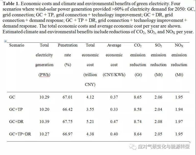 表1、風(fēng)光綠色電力帶來的經(jīng)濟(jì)成本和氣候環(huán)境指標(biāo)的差異