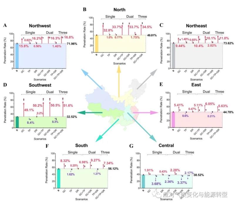 接下來,研究考慮了三種促進(jìn)風(fēng)能-太陽能利用的策略(即區(qū)域電網(wǎng)互聯(lián)、技術(shù)進(jìn)步和需求響應(yīng)),并量化了它們對風(fēng)能-太陽能滲透率的潛在影響。區(qū)域電網(wǎng)互聯(lián)情景意味著,模型考慮連接區(qū)域電網(wǎng)(如西北電網(wǎng))內(nèi)的省域電網(wǎng),并在區(qū)域電網(wǎng)尺度上進(jìn)行空間優(yōu)化和模型求解;就技術(shù)進(jìn)步情景而言,我們提高風(fēng)機(jī)輪轂高度,即使用140m高度的風(fēng)機(jī)替代100m高度的風(fēng)機(jī);同時(shí),采用跟蹤式光伏支架替代固定式光伏支架。已有研究表明,與固定式光伏支架相比,采用跟蹤式光伏支架,可以提高20%-40%的光伏發(fā)電量。就需求響應(yīng)情景而言,我們在需求側(cè)調(diào)整負(fù)荷曲線,使其更好地與新能源供給曲線相匹配。具體地,我們將需求響應(yīng)的潛力設(shè)為10%。我們評估了每種策略的影響,以及多種策略組合的綜合影響,共計(jì)8種情景。