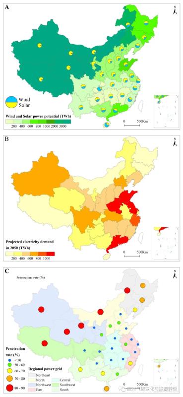 圖1、中國風(fēng)電光伏發(fā)電潛力、2050年各省用電需求以及2050年中國不同省份的風(fēng)光滲透率