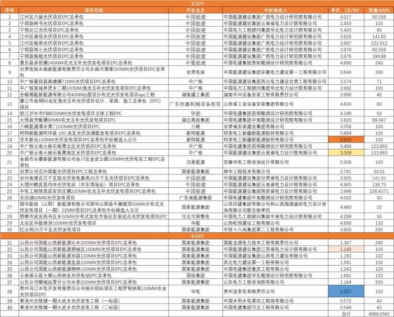 在小EPC方面,由于招標(biāo)范圍內(nèi)采購設(shè)備的具體情況不同,故價(jià)格也有一定差距,總體而言,其價(jià)格區(qū)間基本落在1.5元/瓦左右。這里需要強(qiáng)調(diào)的是,華電貴州羅甸納尾100MW農(nóng)光互補(bǔ)項(xiàng)目是此前華電招標(biāo)的6個(gè)項(xiàng)目之一,當(dāng)時(shí)由于某種原因并未公布中標(biāo)人,而后又重新進(jìn)行了招標(biāo)。而國家能源集團(tuán)的果洛州牧光項(xiàng)目,不含升壓站、外送線路,組件、逆變器、支架和箱變等設(shè)備采購,主要是光伏場區(qū)范圍內(nèi)的施工,故價(jià)格最低為0.548、0.572元/瓦。