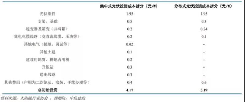 事實(shí)上,由于升壓站、土地、送出線路、配儲(chǔ)等成本的積累,推高了集中式光伏投資成本。根據(jù)中國光伏協(xié)會(huì)數(shù)據(jù),以組件價(jià)格1.95元/W測算,集中式光伏電站單位投資成本為4.2元/W,分布式光伏電站單位投資成本為3.2元/W,集中式電站高出分布式電站近1元/W。