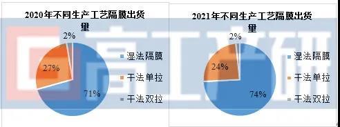 從隔膜產(chǎn)品結(jié)構(gòu)來看,2021年中國(guó)鋰電隔膜市場(chǎng)出貨仍以濕法隔膜為主,市場(chǎng)占比74%。濕法隔膜市場(chǎng)占比提升的原因?yàn)椋?)下游對(duì)性能要求逐步提升,濕法隔膜厚度更薄,可提高鋰電池能量密度;2)下游需求旺盛,行業(yè)供求偏緊,濕法隔膜產(chǎn)能投放大于干法隔膜,推動(dòng)濕法隔膜出貨量。2021年干法占比雖有所減少,但其出貨量保持快速增長(zhǎng),主要受儲(chǔ)能、小動(dòng)力電池增長(zhǎng)帶動(dòng)。