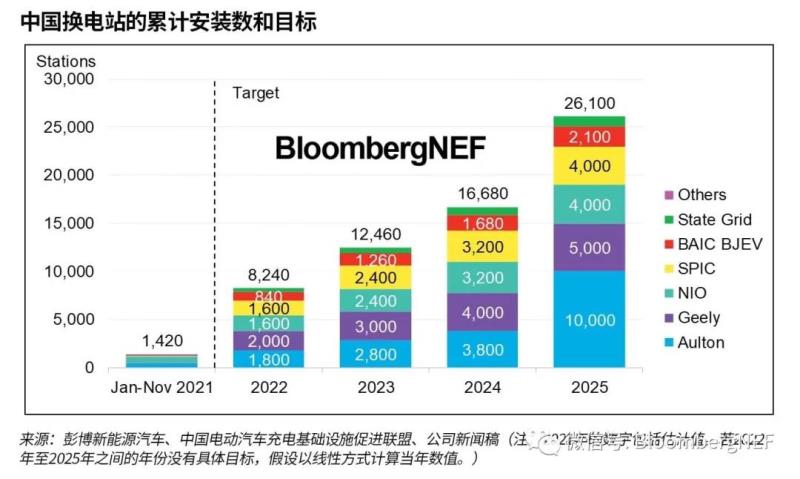 企業(yè)投資的上升可能也有助于推動新建換電站。彭博新能源財(cái)經(jīng)統(tǒng)計(jì),共有六家中國公司計(jì)劃到2022年建設(shè)超過8,000座換電站,并到2025年建設(shè)26,000個(gè)站點(diǎn)。如果這些目標(biāo)得以實(shí)現(xiàn),換電站數(shù)量將遠(yuǎn)遠(yuǎn)超過政府的目標(biāo)。奧動新能源是一家純換電運(yùn)營商,提出了最為雄心勃勃的換電站建設(shè)目標(biāo),吉利汽車和蔚來緊隨其后。