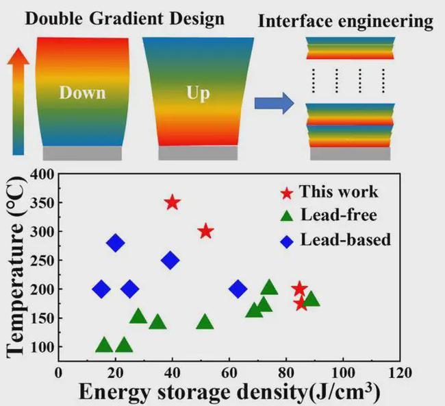 針對這一問題,西安交通大學(xué)金屬材料強(qiáng)度國家重點(diǎn)實(shí)驗(yàn)室馬春蕊副教授與微電子學(xué)院劉明教授合作,通過選取17 mol% HfO2摻雜BaTiO3、1 mol% SiO2摻雜BaZr0.35Ti0.65O3和0.85BaTiO3-0.15Bi(Mg0.5Zr0.5)O3三種無鉛鈦酸鋇基材料構(gòu)建了一種應(yīng)變和介電常數(shù)雙梯度的儲能薄膜電容器。以介電常數(shù)梯度來平衡薄膜中電場的分布,減緩電子在薄膜中的傳輸,提高擊穿強(qiáng)度。以應(yīng)變梯度來提升高溫區(qū)的介電常數(shù),實(shí)現(xiàn)介電常數(shù)寬溫區(qū)內(nèi)的穩(wěn)定性。在應(yīng)變和介電常數(shù)雙梯度的協(xié)同作用下,使得無鉛鈦酸鋇基薄膜電容器的工作溫區(qū)提升至350℃,明顯高于現(xiàn)有商業(yè)X8R, X9R電容器的工作溫度。這一設(shè)計(jì)具有很強(qiáng)的普適性,為進(jìn)一步提高介電電容器的高溫儲能特性開辟了新的途徑。