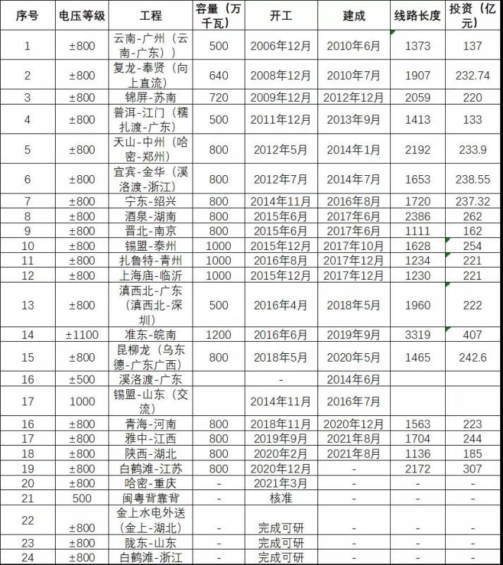 當(dāng)前,我國建成、在建和完成可研的特高壓直流如表1: