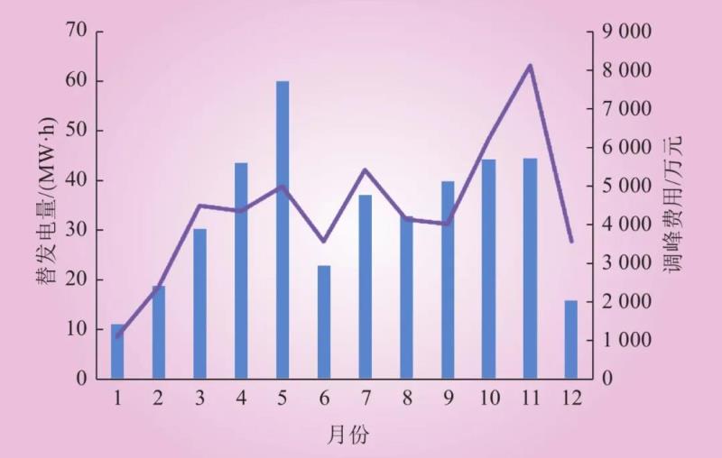 截至2019年年底,西北省間調(diào)峰輔助服務(wù)市場(chǎng)有償調(diào)峰交易6230筆,調(diào)峰電量40.26億kW·h,調(diào)峰費(fèi)用共計(jì)52621.65萬元。除此之外,啟停調(diào)峰9臺(tái)次,合計(jì)費(fèi)用1080萬元。虛擬儲(chǔ)能目前以甘肅蘭鋁電廠為試點(diǎn),總計(jì)調(diào)峰電量2297.5 MW·h,費(fèi)用11.51萬元。全年各月市場(chǎng)交易情況如圖3所示。相比于市場(chǎng)開展前,預(yù)計(jì)年度有償調(diào)峰空間為95.81億kW·h。市場(chǎng)開展初期,有償調(diào)峰交易電量占預(yù)計(jì)有償調(diào)峰空間的42%左右,說明所設(shè)計(jì)的調(diào)峰市場(chǎng)機(jī)制能有效促進(jìn)市場(chǎng)主體挖掘調(diào)峰空間。