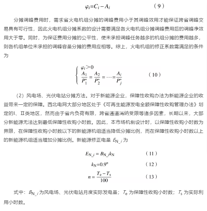 在進(jìn)行市場(chǎng)機(jī)制設(shè)計(jì)時(shí),一方面,要充分發(fā)揮稀缺資源的價(jià)值,必須從市場(chǎng)交易品種的設(shè)計(jì)以及參與方式出發(fā),為具備調(diào)峰能力的機(jī)組設(shè)計(jì)與之相適應(yīng)的市場(chǎng)品種以及市場(chǎng)參與方式,充分激勵(lì)機(jī)組參與調(diào)峰市場(chǎng);另一方面,從市場(chǎng)費(fèi)用分?jǐn)倎砜?,調(diào)峰需求省的省內(nèi)所有電源企業(yè)都有承擔(dān)電網(wǎng)調(diào)峰的義務(wù),即跨省調(diào)峰費(fèi)用應(yīng)該由省內(nèi)所有機(jī)組進(jìn)行分?jǐn)?,各類機(jī)組的分?jǐn)偡绞?,既要符合科學(xué)、合理的原則,又要“以分?jǐn)偞傧{”,從分?jǐn)偨嵌乳g接激勵(lì)機(jī)組參與調(diào)峰。
