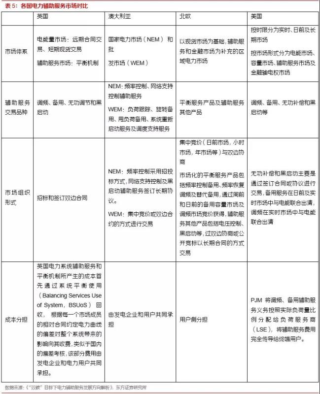 以美國(guó)、英國(guó)、澳大利亞、北歐為代表的國(guó)家電力市場(chǎng)發(fā)展成熟,主要產(chǎn)品是調(diào)頻、備用、無(wú)功調(diào)節(jié)、黑啟動(dòng)等,市場(chǎng)通過(guò)競(jìng)價(jià)或長(zhǎng)期協(xié)議的方式交易,服務(wù)費(fèi)用通過(guò)輸配電價(jià)傳導(dǎo)到用戶側(cè)由終端電力用戶承擔(dān)。市場(chǎng)機(jī)制更為合理,更能體現(xiàn)電力輔助服務(wù)的實(shí)際價(jià)值。