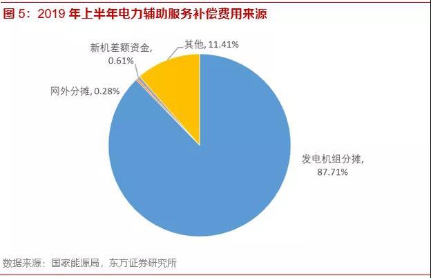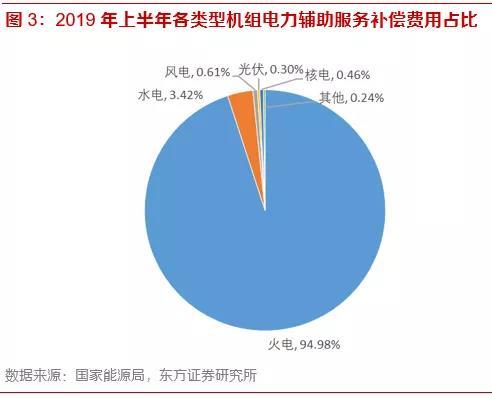 目前我國(guó)的電力輔助服務(wù)由發(fā)電側(cè)提供,主要是火電廠,其次是水電廠。根據(jù)國(guó)家能源局公布的數(shù)據(jù),2019年上半年,電力輔助服務(wù)市場(chǎng)補(bǔ)償費(fèi)用共130.31億元,占上網(wǎng)電費(fèi)總額的1.47%。其中,火電機(jī)組的補(bǔ)償費(fèi)用占比為94.98%,水電站占比為3.42%。