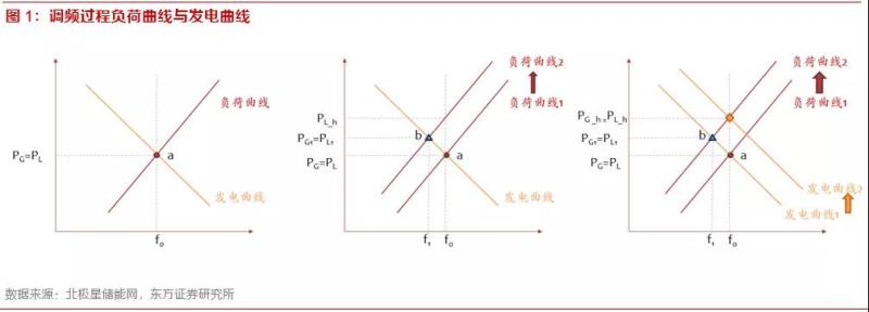 調(diào)頻是指由于用戶負(fù)荷波動(dòng),引起電力系統(tǒng)供需不平衡,導(dǎo)致電網(wǎng)頻率改變,為了維持頻率穩(wěn)定,需要發(fā)電側(cè)調(diào)整功率。我國(guó)電網(wǎng)頻率為50Hz,允許的波動(dòng)偏差為±0.2Hz??梢酝ㄟ^(guò)負(fù)荷特性曲線和發(fā)電特性曲線理解調(diào)頻過(guò)程。