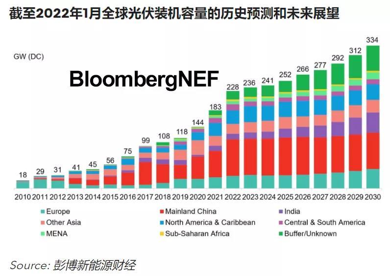 我們預(yù)計(jì)2022年將成為新建光伏裝機(jī)容量超過(guò)200GW的第一年,除非在媒體報(bào)道披露各國(guó)2021年裝機(jī)容量數(shù)據(jù)后該年份實(shí)際總量已超出這一數(shù)值。