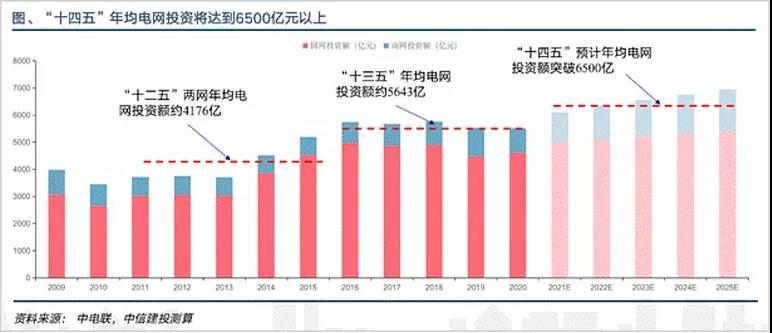 南方電網(wǎng)在“十四五”期間的計(jì)劃是總投約6700億元,較“十三五”總投資增長(zhǎng)約22%。兩者合計(jì)總投資就高達(dá)2.9萬億元,如果算上地區(qū)電網(wǎng)公司,“十四五”期間全國(guó)電網(wǎng)總投資預(yù)計(jì)達(dá)到3萬億元。