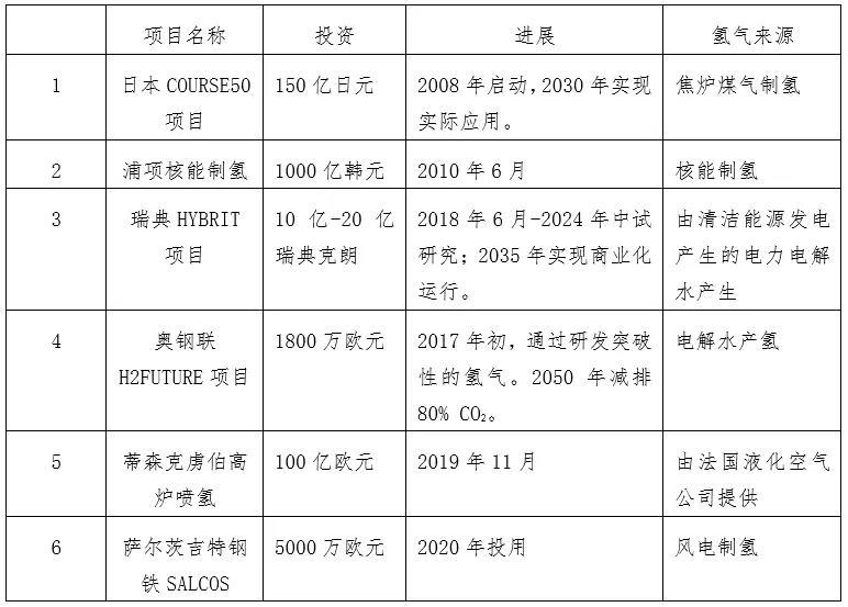 國外在氫冶金方面起步較早,早在1955年,HYL公司建成一座有5個反應罐的直接還原廠,還原氣含H2 75%、CO 14%、CO2 8%、CH4 3%、H2O 1%、 H2/CO=5.36,后發(fā)展為HYL-III豎爐。20世紀80年代西歐進行了全氫氣基豎爐工業(yè)探索實踐,入爐H2量均高于3000Nm3/tDRI,驗證了使用100% H2的氣基豎爐直接還原技術可行。20世紀 90年代中期,美國的埃德加-湯姆森鋼鐵廠3號高爐噴吹焦爐煤氣。近年來,日、韓、歐盟、瑞典、德、美等國均有氫冶金規(guī)劃:日本COURSE50富氫還原煉鐵、歐盟ULCOS計劃ULCORED富氫氣基豎爐和氫氣還原煉鋼、奧鋼聯(lián)H2FUTURE、瑞典HYBRIT全氫豎爐、德國蒂森克虜伯高爐噴氫、美國AISI氫氣閃速熔煉、韓國COOLSTAR、美國MIDREX H2、德國薩爾茨吉特鋼鐵SALCOS等項目。