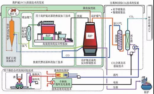 目前,以碳冶金為本質的鋼鐵行業(yè),碳排放量巨大。長流程高爐煉鐵碳排放量約占整個鋼鐵生產(chǎn)碳排放量的70%。2020年鋼鐵行業(yè)用焦炭量約3億噸,僅焦炭帶來的碳排放就11億噸。鑒于鋼鐵行業(yè)碳中和目標的緊迫性,鋼鐵行業(yè)必須采用突破性的低碳煉鐵技術減少碳排放或通過CCUS技術實現(xiàn)脫碳。氫冶金減碳技術路線主要分為兩種:富氫還原高爐和氫氣氣基豎爐直接還原煉鐵。