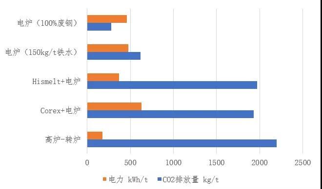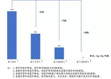 我國現(xiàn)有高爐和轉爐路線碳排放量為1.765噸CO2/噸鐵。對于高品位的鐵礦石,可采用直接還原和電弧爐路線。采用以80%的天然氣直接還原鐵和20%的廢鋼生產(chǎn)工藝,天然氣先經(jīng)過裂解或重整,產(chǎn)生C、CO、H2。由于天然氣本身含氫元素,參與還原反應的碳比高爐少,碳排放量明顯降低。據(jù)測算,比現(xiàn)有的高爐轉爐路線,可降低碳排放量47%。采用以80%的綠色氫氣直接還原鐵和20%的廢鋼生產(chǎn)工藝,可降低75%碳排放。當全部采用100%綠色氫氣直接還原鐵和電弧爐路線時,幾乎沒有碳排放。