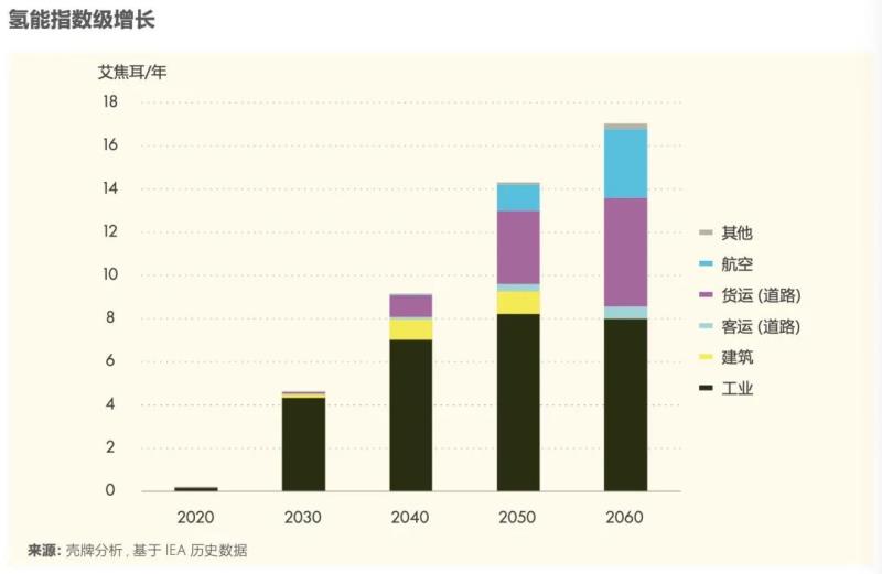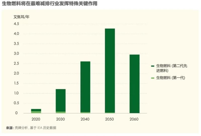 殼牌報告預(yù)計,中國的氫氣消費量將從目前的極低水平增長至2060年的17艾焦耳/年以上。這相當(dāng)于5.8億噸煤當(dāng)量,或者最終能源消費總量的16%。生物燃料的使用量將從目前相對溫和的水平增長至2040年的近5艾焦耳/年。不過,生物燃料需求在2045年達(dá)到峰值后,將出現(xiàn)下降,其原因有兩個:一是電氣化范圍的擴(kuò)大,導(dǎo)致公路客運對將生物燃料與液態(tài)化石燃料摻混使用的需求減少;二是重型公路和鐵路運輸中氫使用量的增長。到 2060 年,生物燃料需求將緩降至3艾焦耳/年以下。