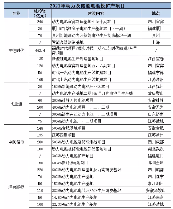 以下為2021年中國動力電池投擴(kuò)產(chǎn)回顧: