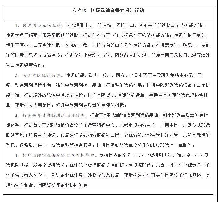 發(fā)揮中國—新加坡互聯(lián)互通項(xiàng)目示范效應(yīng),加強(qiáng)與周邊國家協(xié)商合作,持續(xù)推動(dòng)西部陸海新通道鐵海聯(lián)運(yùn)提質(zhì)增效,促進(jìn)跨境班列班車發(fā)展。優(yōu)化國際海運(yùn)航線網(wǎng)絡(luò)布局,提高中韓陸海聯(lián)運(yùn)效率,推動(dòng)中歐陸海快線健康發(fā)展,擴(kuò)大“絲路海運(yùn)”品牌影響。穩(wěn)固?hào)|南亞、東北亞等周邊航空運(yùn)輸市場,有序拓展歐洲、北美洲、大洋洲等洲際航線網(wǎng)絡(luò),建設(shè)“空中絲綢之路”。穩(wěn)步擴(kuò)大國際道路運(yùn)輸便利化協(xié)定簽署實(shí)施范圍。優(yōu)化國際聯(lián)程聯(lián)運(yùn)組織和中轉(zhuǎn)服務(wù),完善海外轉(zhuǎn)運(yùn)服務(wù)網(wǎng)絡(luò)。